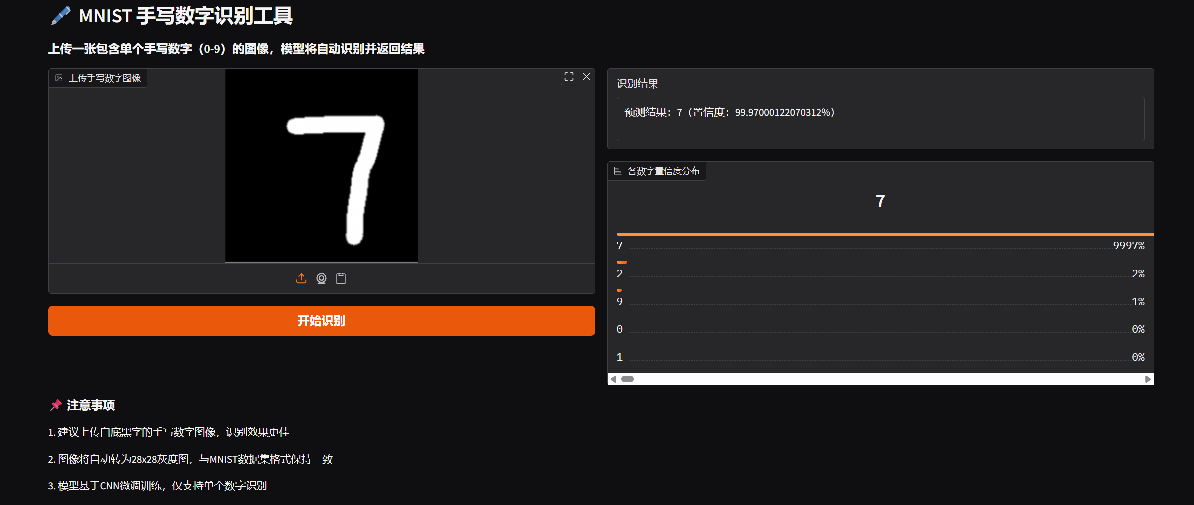 上传一张白底黑字的手写数字图像(清晰无干扰的图像识别效果更佳),无需手动点击识别按钮,图像上传后会自动触发识别,右侧输出区会实时显示识别结果与置信度分布。