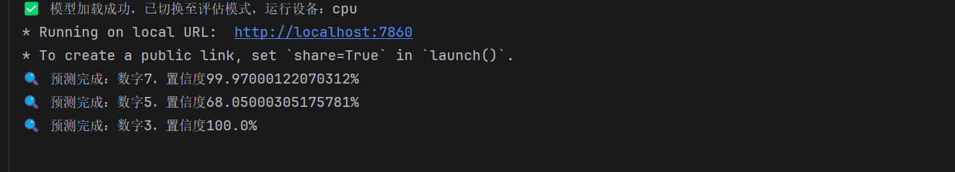 本次我们完整实现了从「MNIST 模型从头训练」到「Gradio Web 应用搭建」的全流程,核心成果有两点: