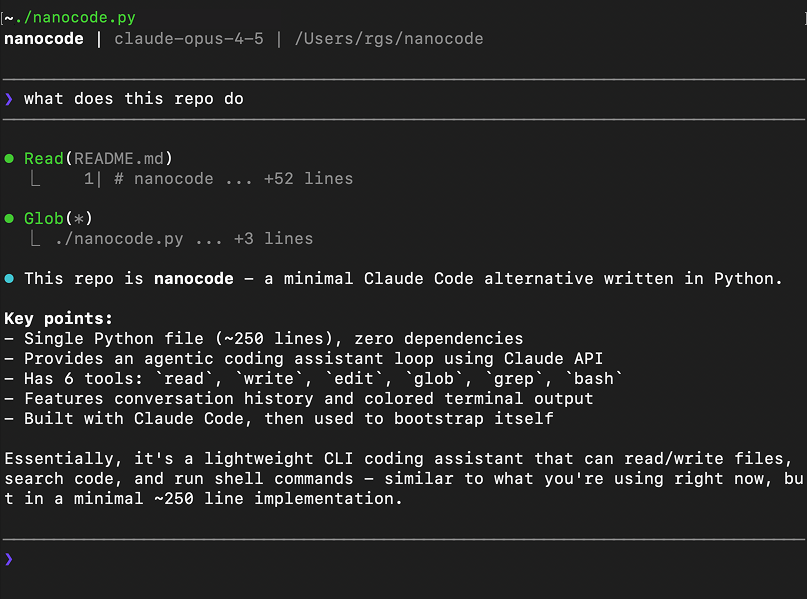 print(f"{BOLD}nanocode{RESET} | {DIM}{MODEL} ({'OpenRouter' if OPENROUTER_KEY else 'Anthropic'}) | {os.getcwd()}{RESET}\n")