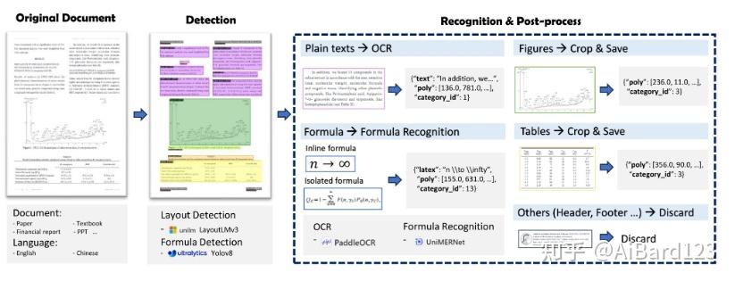 - 版面检测:使用 LayoutLMv3 模型进行区域检测,如检测图片、表格、标题、文本等。